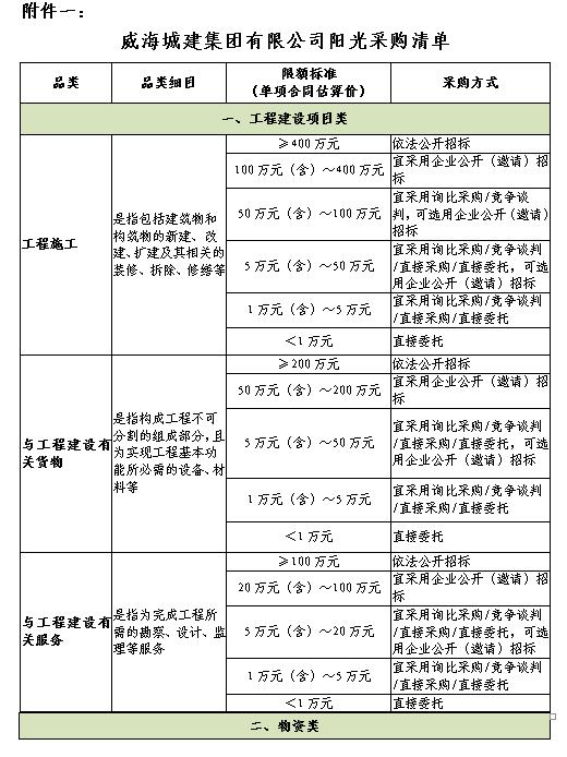 附件一:威海城建集團(tuán)有限公司陽光采購清單