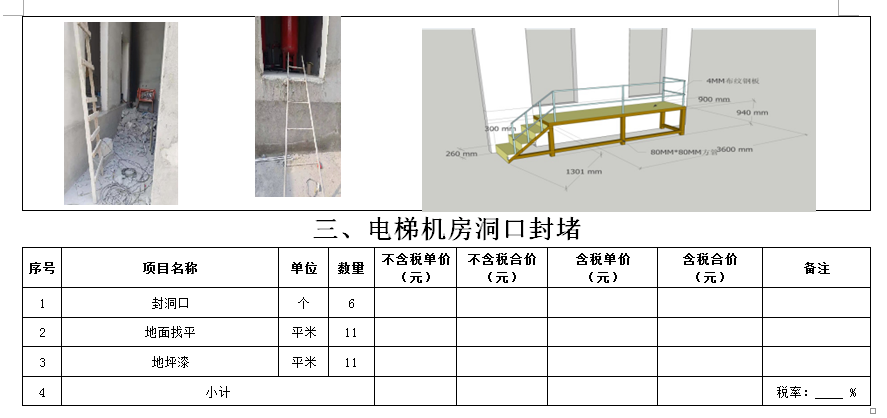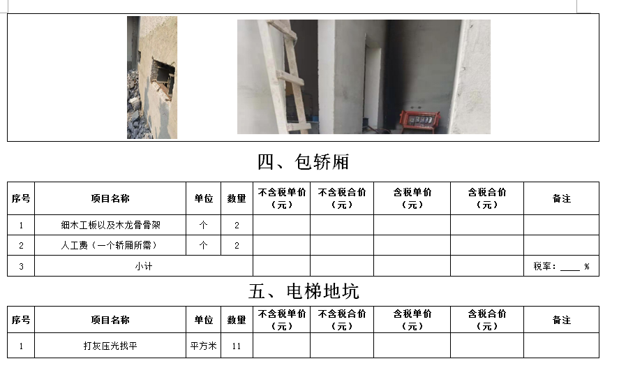 (5)采購(gòu)范圍:電梯洞口門(mén)套、鋼爬梯、電梯機(jī)房洞口封堵、包轎廂、地面找平、地下車(chē)庫(kù)出入口真石漆等(詳見(jiàn)清單)等相關(guān)工作,具體內(nèi)容詳見(jiàn)采購(gòu)文件。